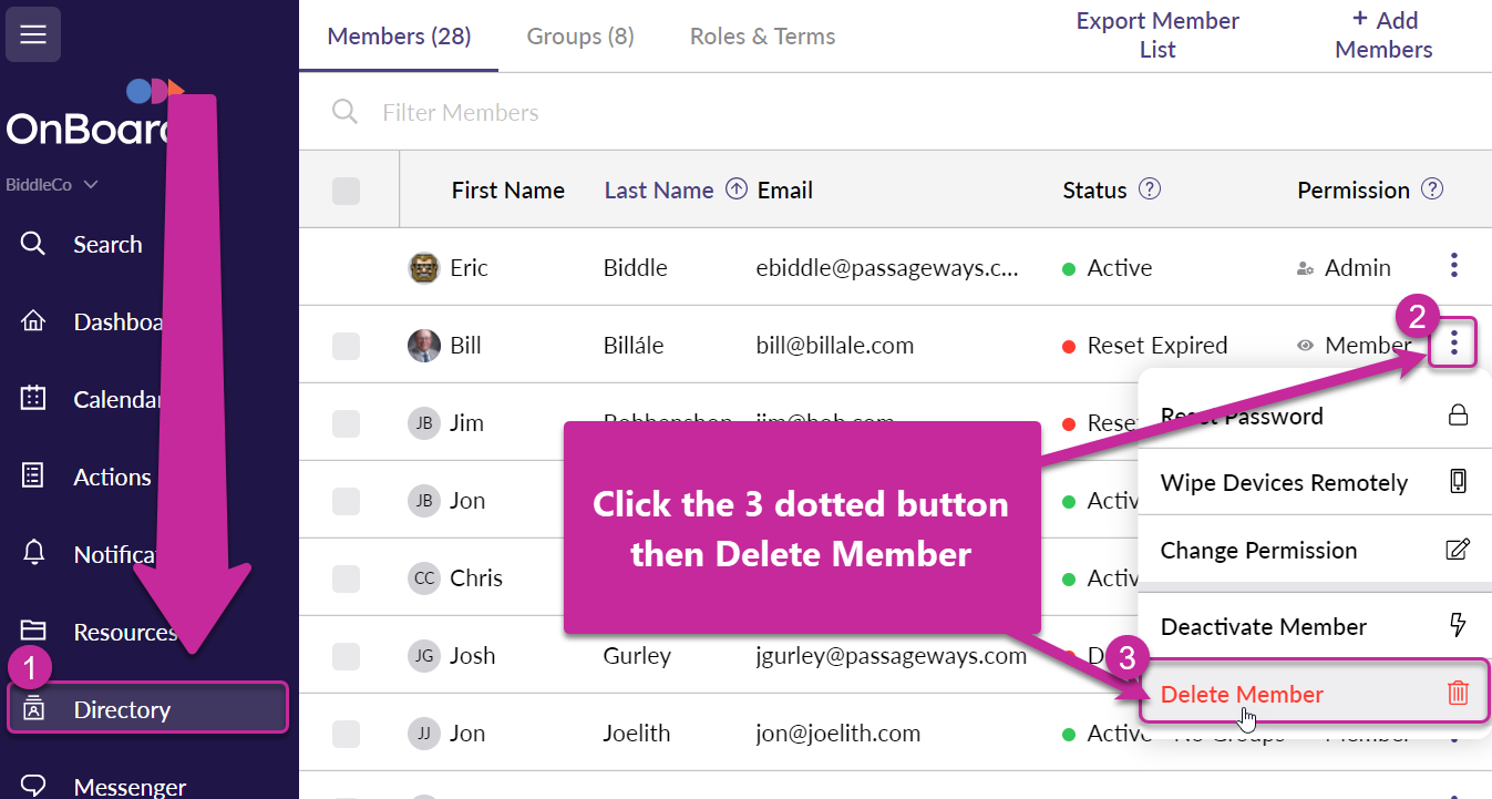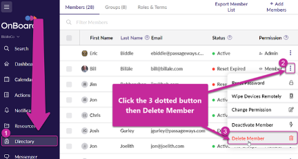 A user can be deleted from your Organization permanently. However, please note that deleting a user from the Organization does NOT delete their OnBoard account. They will still have an OnBoard account but will be fully removed from your Organization in OnBoard, and all OnBoard app data will be removed from their mobile device.