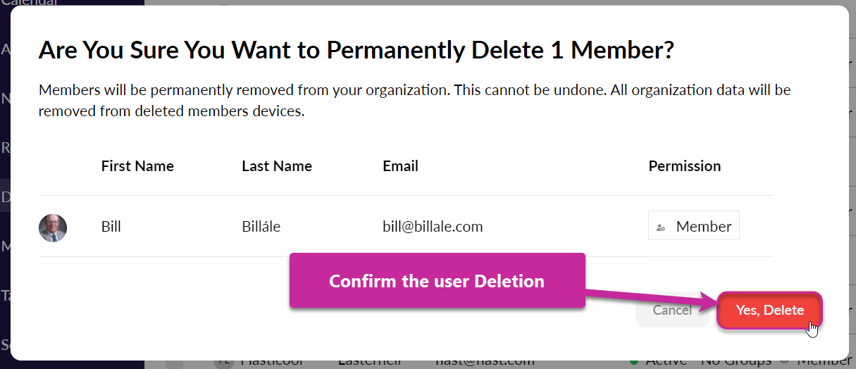You'll be asked to confirm this step since this is a permanent deletion. Select Yes, Delete and the user will be removed from the Organization.