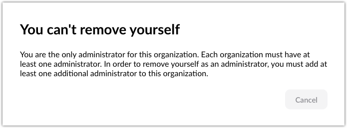 There must be at least one Admin for an Organization. If you attempt to delete yourself and there are no other Admins in your Organization, you'll receive a prompt notifying you that you cannot remove yourself.