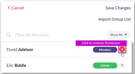 - Select Manage Members and select the X to the right of the departing Admin to remove them from the group