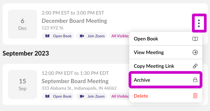 Note: Only a Meeting Admin can archive the meeting. Once archived only the permissions of the meeting can be edited and archiving is a permanent action.