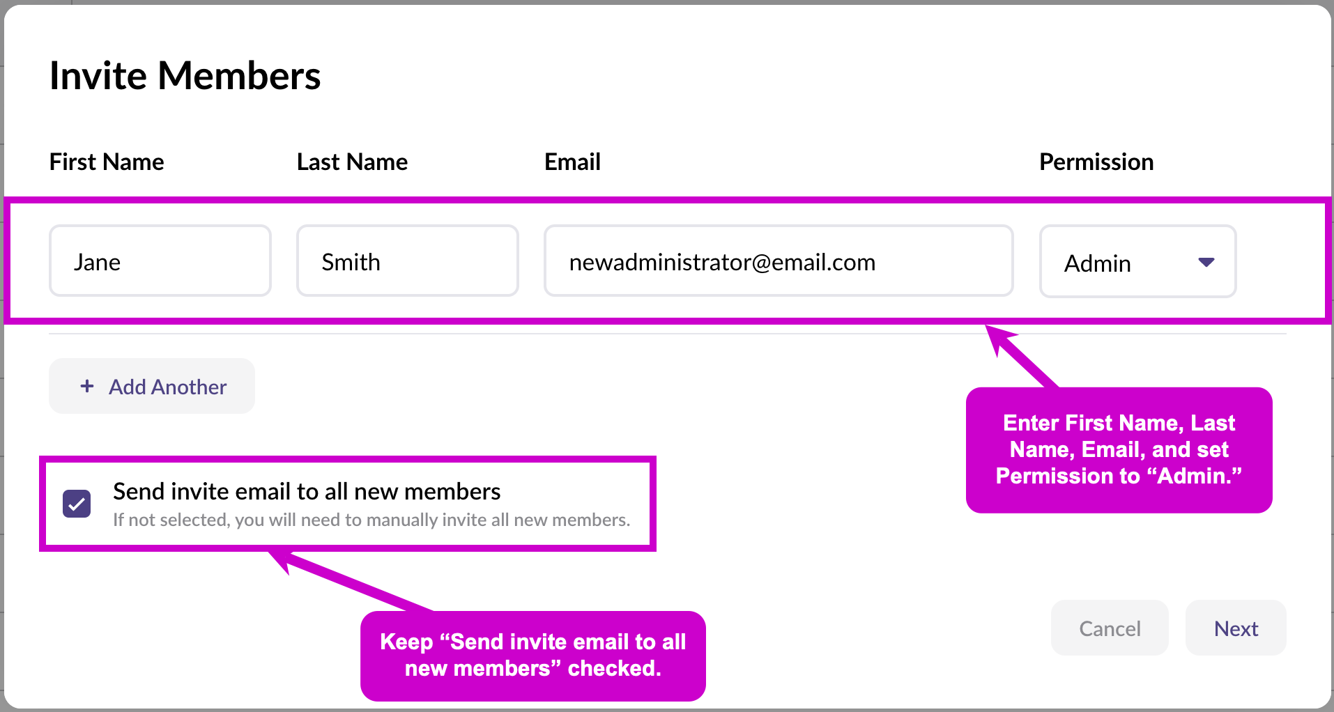 - Enter the member’s First Name, Last Name, and Email