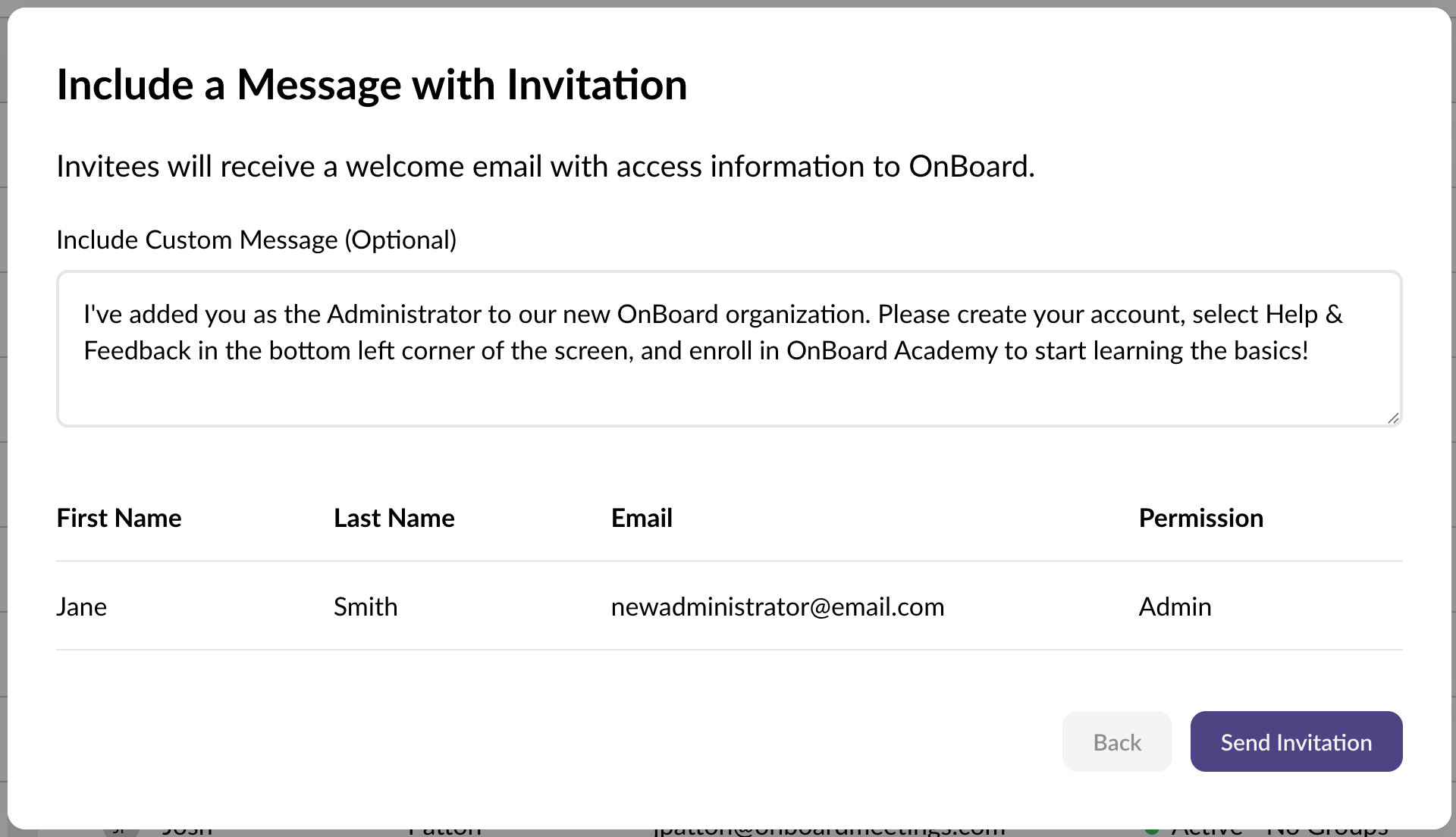 - Add an optional custom message and select Send Invitation