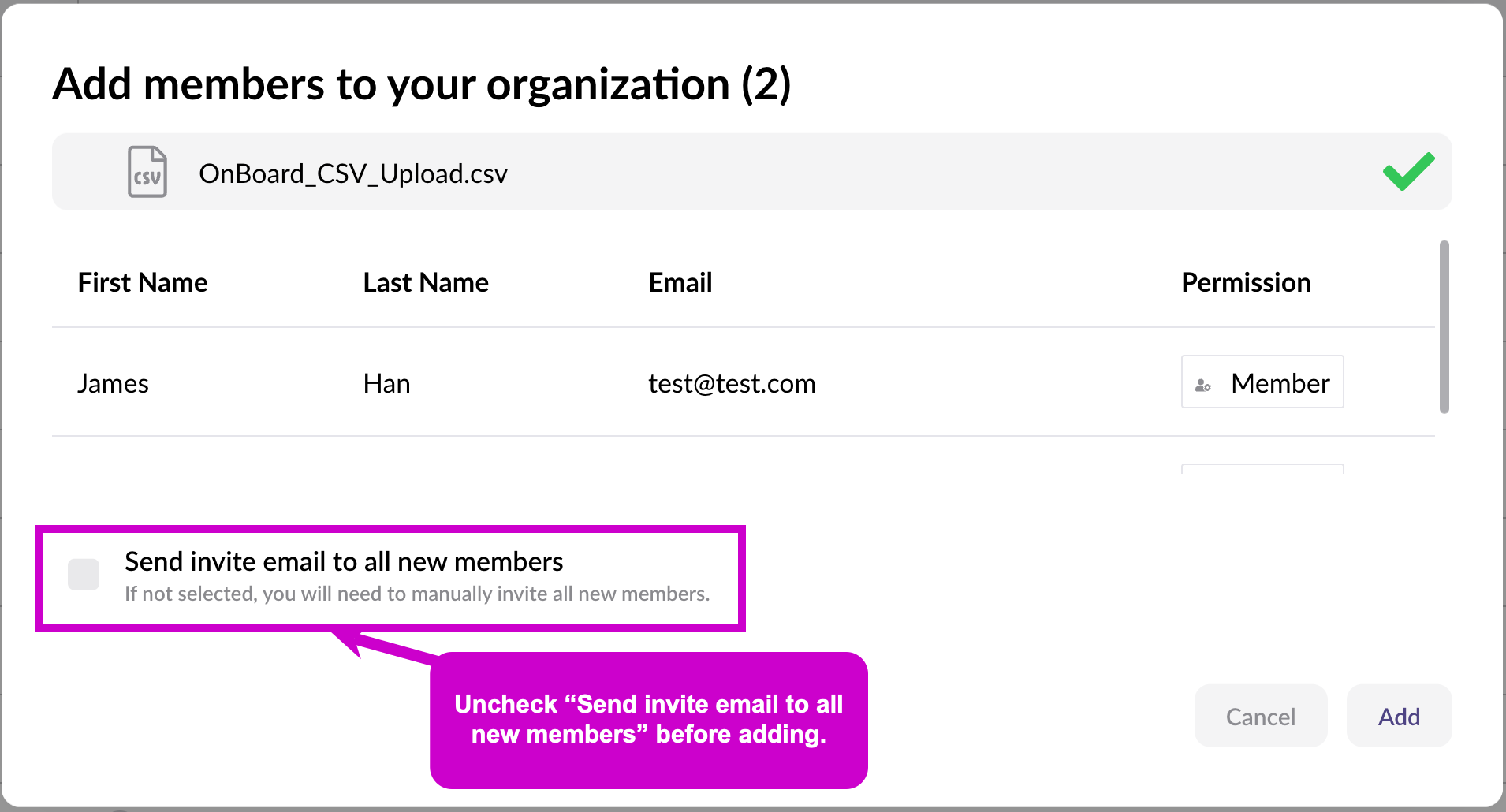 - Uncheck Send invite email to all new members