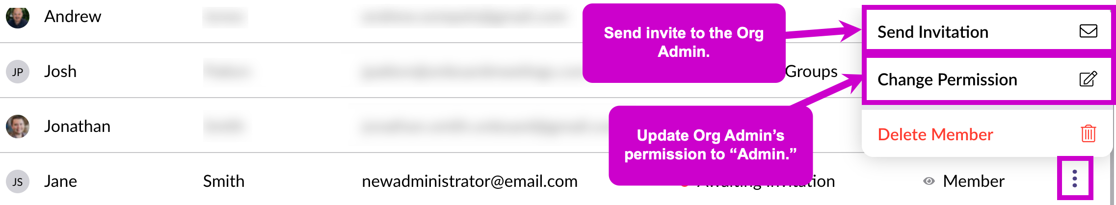 - Update any Organization Admin’s permission to Admin using the three-dot menu next to their name.