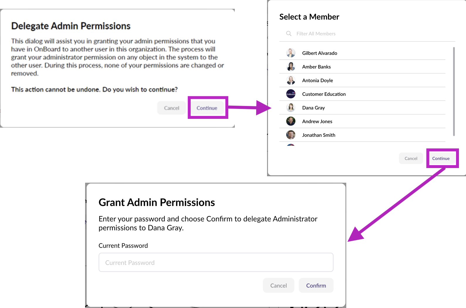 By delegating permissions in advance, Admins can prevent disruptions and avoid situations where no active administrator exists to manage content in your OnBoard environment.