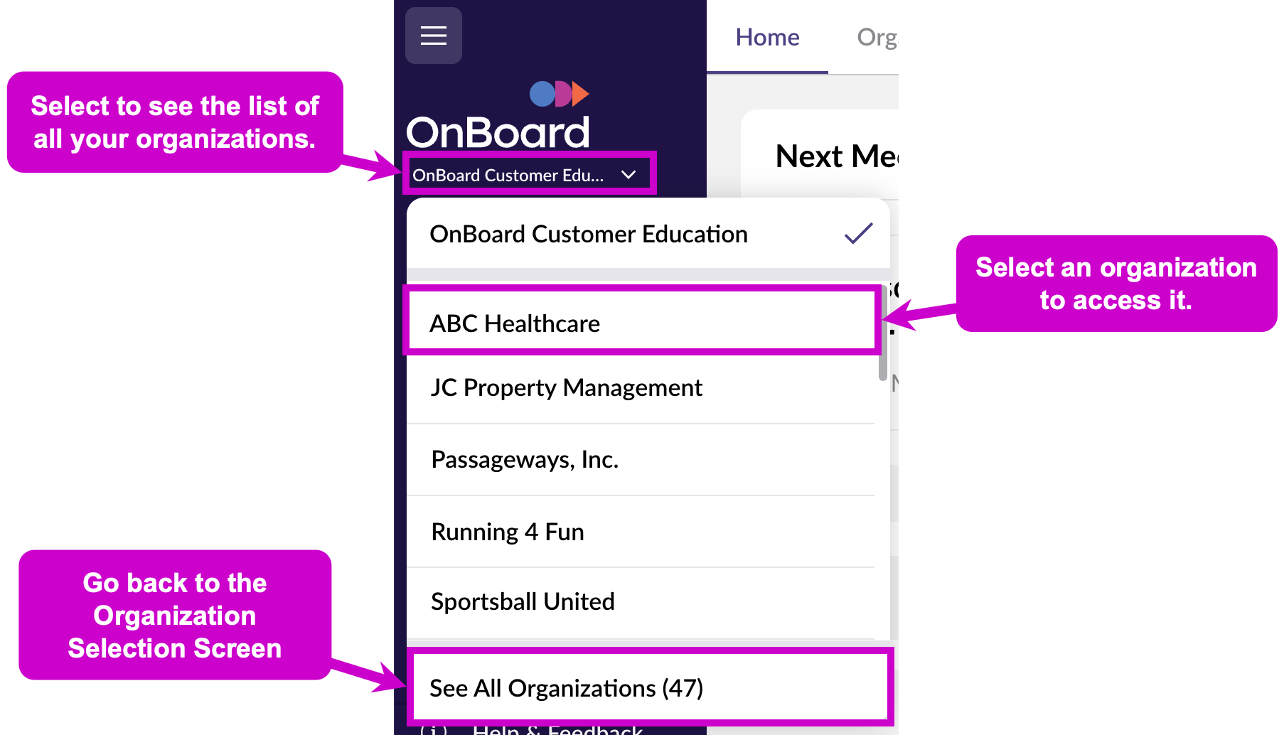 - While inside an organization, select the organization name beneath the OnBoard logo.