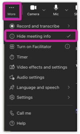 In the Teams Meeting window, select More → Meeting Info.